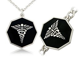 | Designed and made in the UK these medical I.D. tags are struck in high quality Hallmarked Sterling Silver with matching necklace or bracelet. The modern design of these identity tags is intended to alert first aiders and paramedics in the event of an accident to your hidden medical history. The tags are enamelled in a wide variety of colours so there is something to suit everyone.